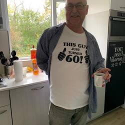 The printed coffee mug and other stuff I bought to celebrate my 60th birthday.
