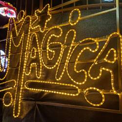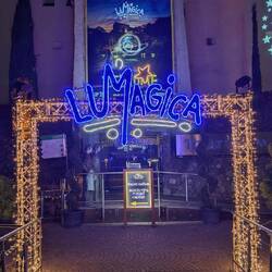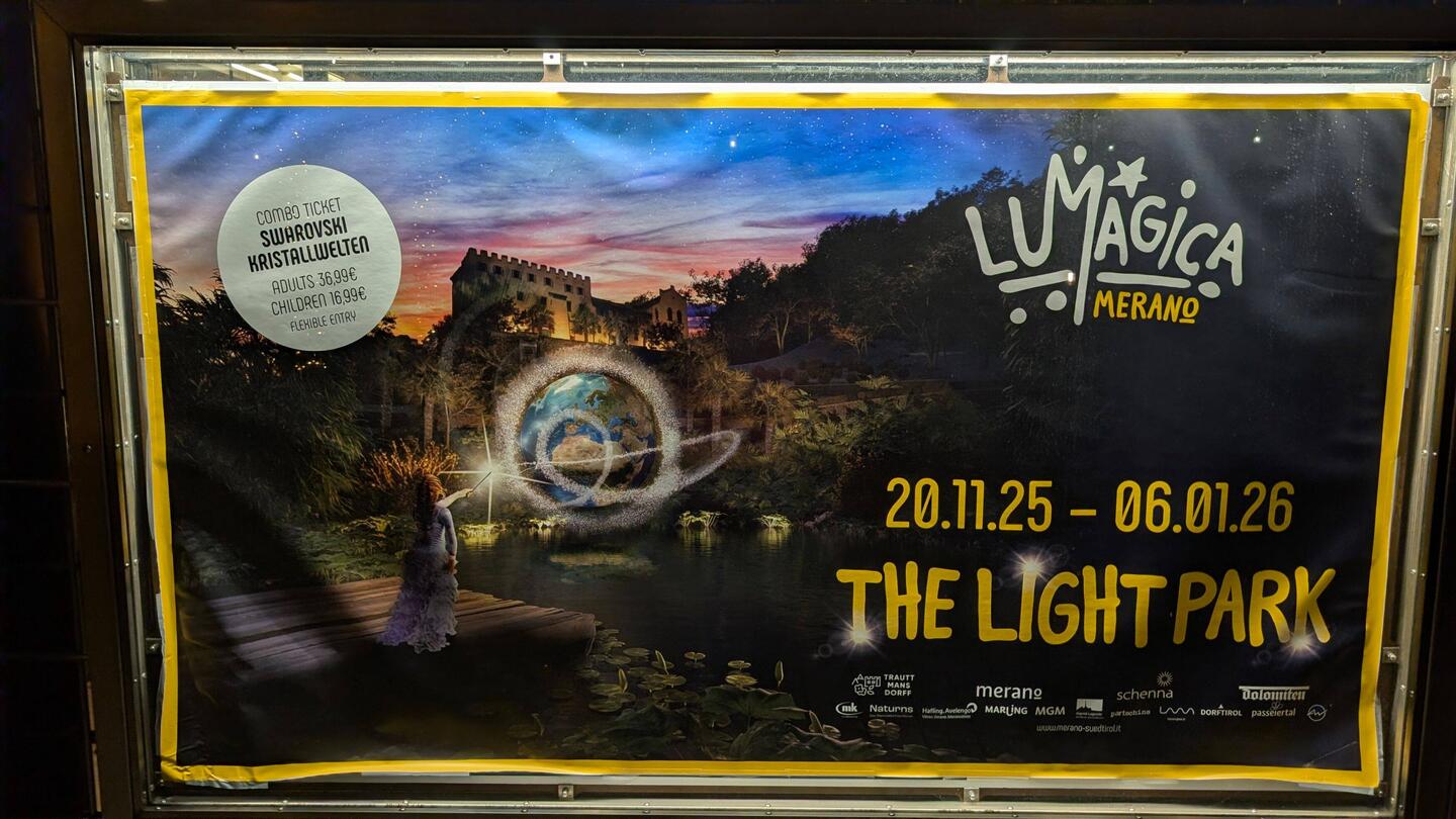 LUMAGICA Meran ist ein abendlicher Lichterpark in den Gärten von Schloss Trauttmansdorff: ein rund 1,3 km langer Rundgang durch inszenierte Lichtwelten (Thema 2025/26: „Sissis Reise um die Welt“)