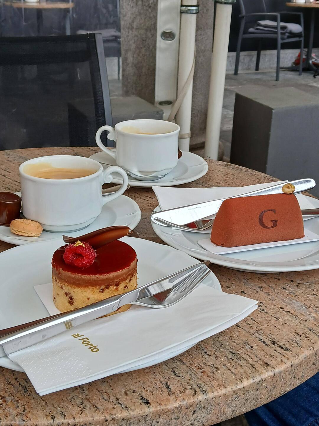 Kaffee trinken und Kuchen essen im La Porto, danach tolles Mittag essen, Ralf aß Kabeljau und ich Kalbsflanke, war sehr 👍
