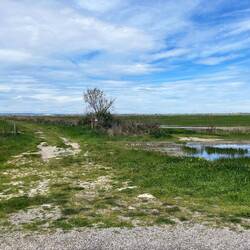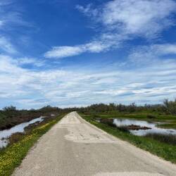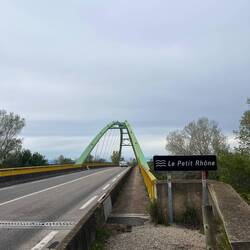It was a perfectly fine first day. Very chilly start in Arles, despite the sun. But eventually the wind died down, some layers came off. And the weather was really pleasant. There was no coffee at the hotel where I was staying this morning, which gave me a good excuse to go to the fancy coffee shop around the corner. I didn’t get away until about 10:15. Stopped at a boulangerie to get a sandwich and then made my way out of the city. The only particularly notable moment of the exit was crossing the river Rhône. It’s almost at its end at that point, and it’s huge. It is not the longest river in France, but apparently it has the most water. No markings to help you on your way until you are a good ways out of town. I was glad I had downloaded a gps track.