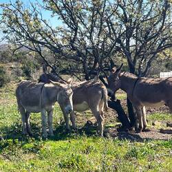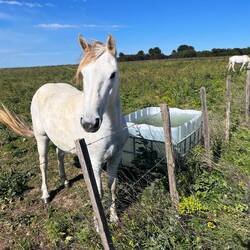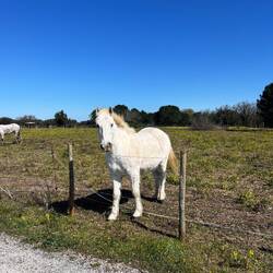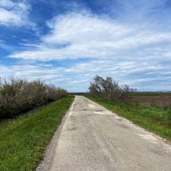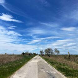 The route was flat, flat, flat. For most of the day I walked along a small paved road, flanked on both sides by marshy farmland. This is the definition of the Camargue - wet, flat, home to white horses and black cattle, some of whom are raised for meat and some to be used in a kind of bull running event in which the humans try to take a cockade (I had to look this up - it’s a rosette or decoration usually made of ribbon) off the head of the bull - rather than kill him. The big “field” crop in the Camargue is rice. I saw a rice research Institute, but I do not think I saw any rice paddies. I did see an enclosure with about 7 or 8 of the black cattle, who announced themselves with cheerful cowbells. They were frolicking, which is not what you expect to see when people are talking about the taureux! All along the road I passed gates for Mas this and Mas that. A mas is a farm, maybe a bit more like a ranch or a hacienda. In this region they have no windows on the north side to protect against the Mistral wind. Most of those I passed were quite hidden from the road. All you see when walking by are the gates. So it’s a lonely (but not creepy) road.