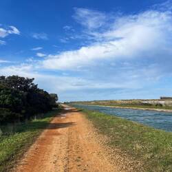 The scariest thing was walking alongside power lines. Instead of making nice straight lines between the poles, the wires were making huge, vibrating arcs over the track I was on. Which way would they fall when they snapped? You could have bodysurfed on the canal, where big swells were alternating with white caps. At one point a banana was blown out of my hand. But somehow birds — including the egrets I scared by a creek — still managed to fly. I spent the entire day with all the layers on.