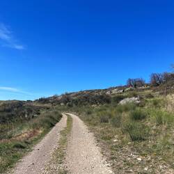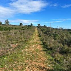 There was a lot of up today! Lots of stones. And a long, long down late in the day. But the trail underfoot this morning was amazing. No erosion. No obstacles. It started going up immediately. Up and over a small mountain? A big big hill? It took about an hour and a half to get to the highest point. The views on the way up were of green hills, some rocky ridges, a river. The views over the other side were of a wide flat plain with mountains way in the distance and, I think, a few flashes of the Mediterranean.