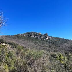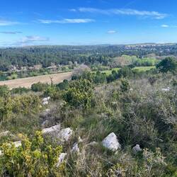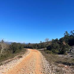 It seemed pretty clear that the woman who runs this morning’s gite was not feeling well and needed us to get going. I was out by 9 so I am getting bit speedier at getting ready! The path went up right away. Something that hasn’t happened here yet!Lots of rocks. A lake that I think — but I might be making this up — was once a bauxite quarry. Lots of thigh-high rosemary bushes and tons of flowering thyme.