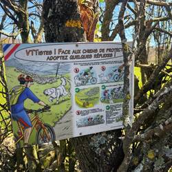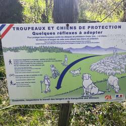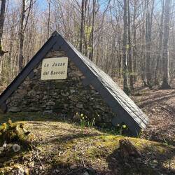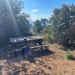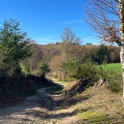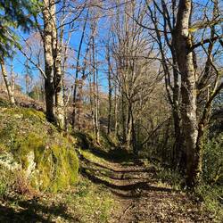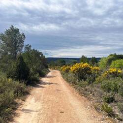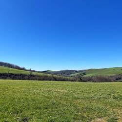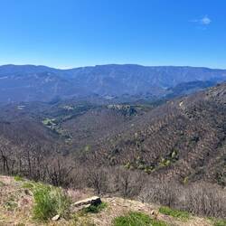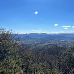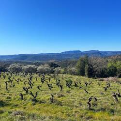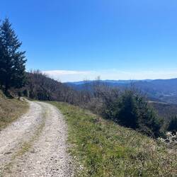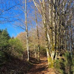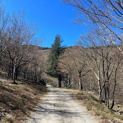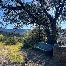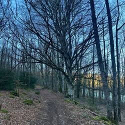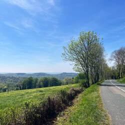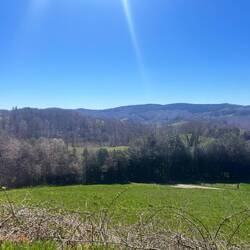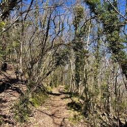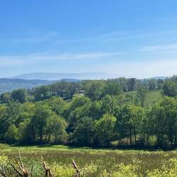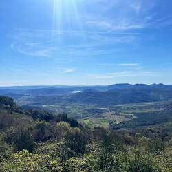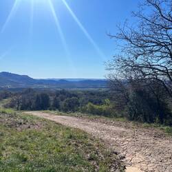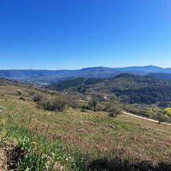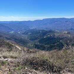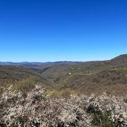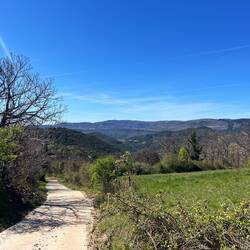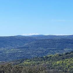 Quick breakfast (banana and kefir) in the gite. Bad coffee at the boulangerie across the street. And then out of the town and pretty shortly going uphill. I was worried about missing views by taking the alternate route today. But the alternate did not start until halfway along, after the highest point. The climbing was mostly on a small track and was a good surface. It was long but not terrible. Though the lack of wind (!!!) did make it hot. Then a good hour walking along the top with spectacular views to the south. At the turnoff for the variant, the main route goes northwest, the variant goes southwest. On a north-facing slope I was back in early spring. Deciduous trees with their leaves just starting to bud. Another great view.