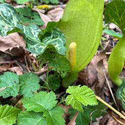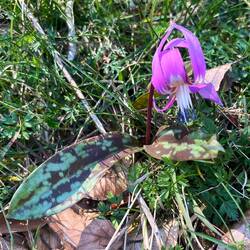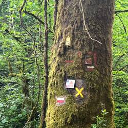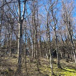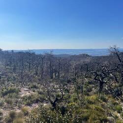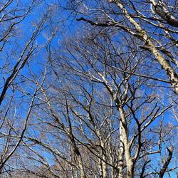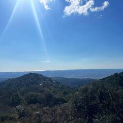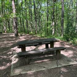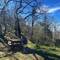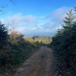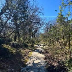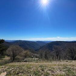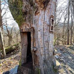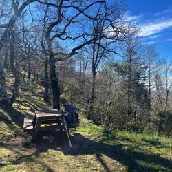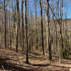 Lots of forests, even at the tops. Sometimes shade. Some of the valleys had no leaves at all yet. Gazillions of trees down. Mostly pines and mostly, but not always, in the plantation forests. There was some scrambling to get around some of them. Tons of birds. Excellent (and only one of two all day) picnic table in the shade for lunch. A cool shelter later on that I forget to take a picture of.