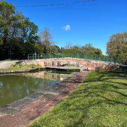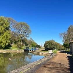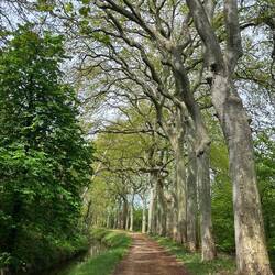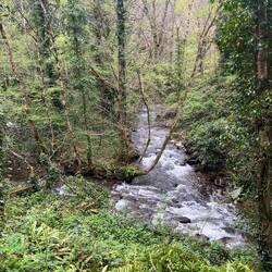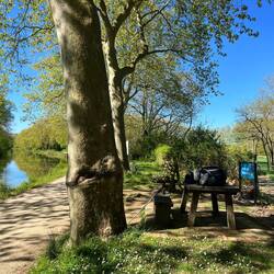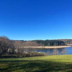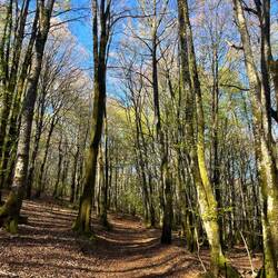 Despite everything getting flatter today, it was still pretty hilly. More beech forests - one with daffodils. Lots of moss-covered stone walls, the semi tidy ones. And eventually up and over the biggest hill of the day to get a view of another reservoir. And then past some impressive forsythias in people’s gardens. And down a small road, lined st various points, with huge dandelions.