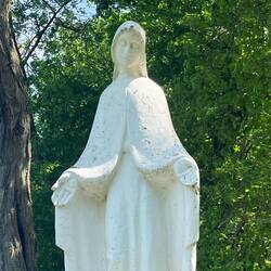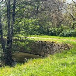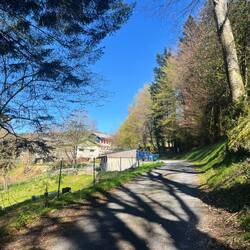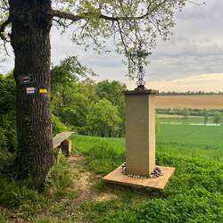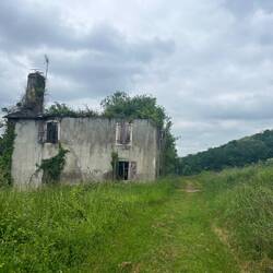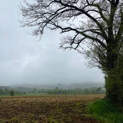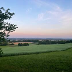 A blessedly short day! Easy walking, mostly down, under a cloudy sky, not too hot! A perfectly pleasant morning. Woods, fields, rural houses. Some dogs - all very proud of themselves for barking me off. There were a few Saturday morning day hikers and dog walkers out.
