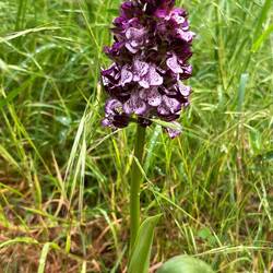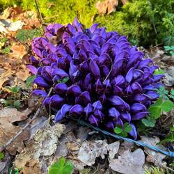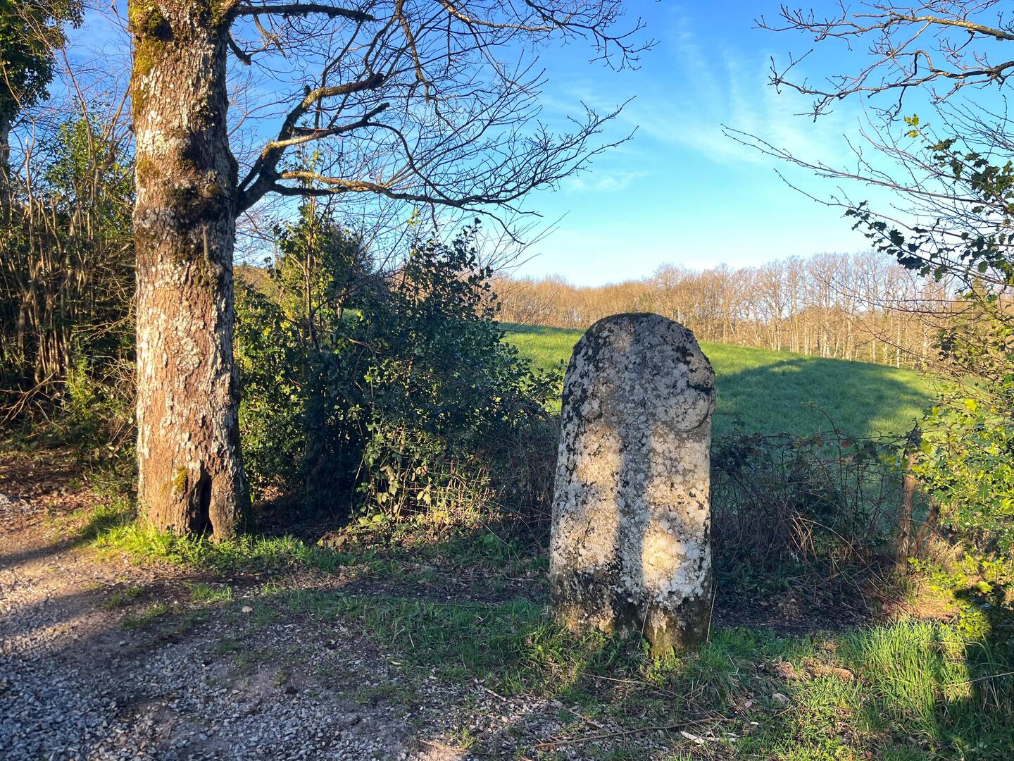 I had just been thinking that I have seen no small animals. But then I did — something that looked like a mink but maybe bigger and a deer. And then later when I was having a croissant on a bench, a mouse came for the crumbs. . Coolest thing today was a weird plant that the internet says is purple toothwort, a parasitic plant that grows on the roots of other plants and has no chlorophyll. There was just one clump. Oh, and I finally saw a menhir, a standing stone. (Yesterday’s gite was Gite L’etape les Menhirs.)