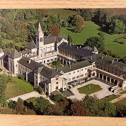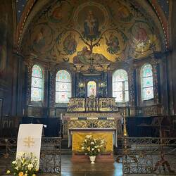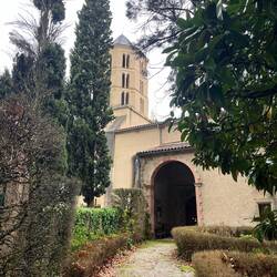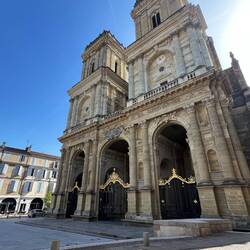 The chemin goes across the top of the city of Pau, through a real forest, one with an understory. Beautiful. And full of people out for their Sunday walks. After the forest the route goes right to the edge of Pau, around a race track. And after that I left the GR markings and went a few blocks south to a grocery store, which closed just as I was leaving, and then a few blocks west to a huge bakery-cafe for lunch. And after that it was a very pleasant walk along mostly green paths, past some kind of zoo, to the village of Lescar. Built on the edge of a hill with amazing views. And a very pretty cathedral.