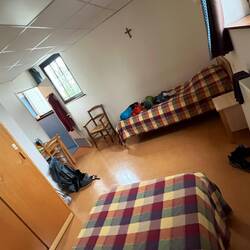 I’m staying in the gite communal, the municipal gite. Massive old presbytery. Thick, thick walls and glacial cold as soon as you open the door. The sleeping rooms are upstairs and thankfully not cold. There are three of us here tonight - the same as last night. The young woman Cyri’elle who has been on the same itinerary as me for days now, and Florence, who is probably more or less my age and is from Brittany and will be doing my next three days in two. Three pilgrims, three bedrooms (each with two beds). We each get our own room.