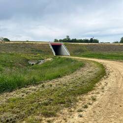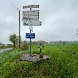 stretches, like the one where the chemin was buried under piles of sand that had something to do with autoroute renovation. A good lot of walking along things — the autoroute, train tracks, construction fencing. And still a fair bit of pavement. And then there was the truck, a big semi truck completely blocking a very rural bit of the chemin. You walk a bit down a hill and turn a bit and the entire track is blocked by a huge truck. Apparently with all the national highway construction going on, gps is very screwed up. And yet - at what point do you not think this mud track is not a place to drive this huge truck!?
