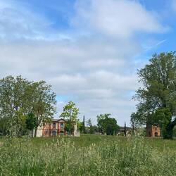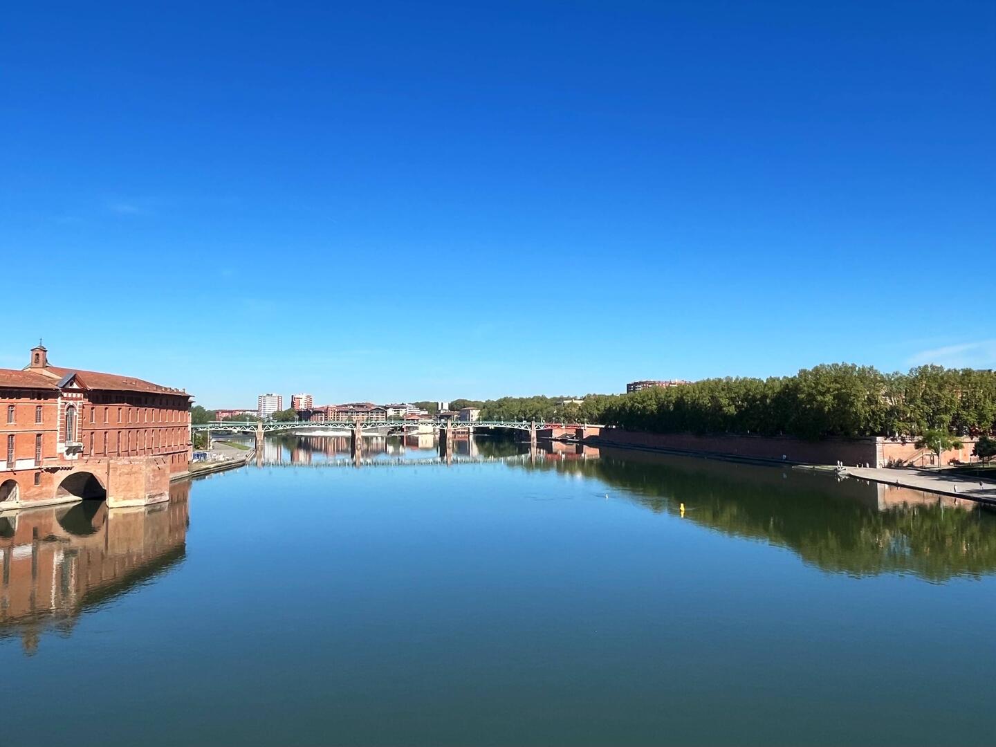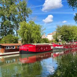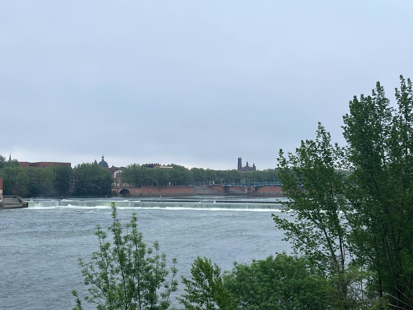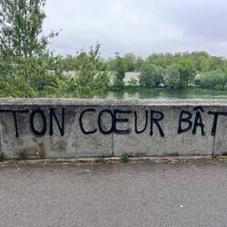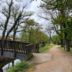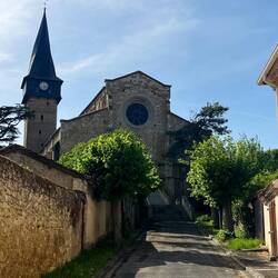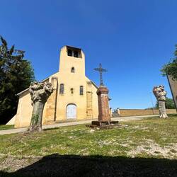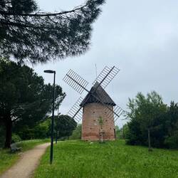 Long walk out of the city. I must have checked the track on my phone a million times. The route I took was not the GR and it is marked, but sparingly. Lots on concrete, more aerospace stuff, huge fences. Roundabout after roundabout. But then there was a town with good coffee and apple pastry. And then a village not too long after that. Another short break for a cold drink at a bar/tabac where I talked with a couple who were going out for their first rides on their brand new, matching, beautiful red bicycles. Quick stop in a church, out the other side of the village, and then finally off the asphalt as the chemin entered a really lovely woodland and followed a “biodiversity” path for a kilometer or two before heading back on the road to come down into Léguevin.