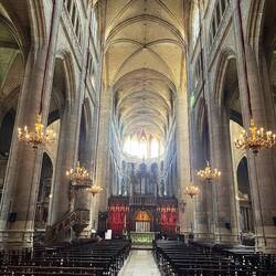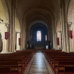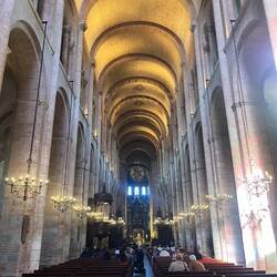 Another green, green day. And oh but it was hot! 27 in the afternoon. And so much asphalt! Sometimes shade. Much of the day was walking into and out of Auch, a small city with a massive cathedral. French churches are often square rather than pointy. But I did not love it inside.