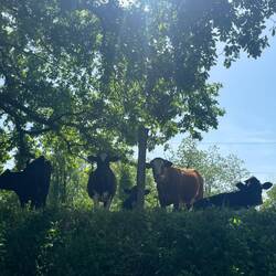 I saw two deers, one of whatever the rodent in the rivers is. A garden full of wire-haired vizslas, none of whom paid the least mind to me as I passed. Lots of cows, some horses and sheep. Easy paths with a few hills. I found two shortcuts on the map that probably kept me out of the shade but saved me about two kilometres.