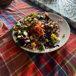 But dinner! First there was an enormous amount of food. Bread and soup (of course). Then a large plate of small chopped vegetables and herbs and flowers and a devilled egg. I thought that was the end. But then a plate of sautéed vegetables, rice, and sausages. I ate a fraction of it all. Then cheese - 4 kinds. Then some kind of fruit bowl with cream and booze. I am being sent away with a small piece of a cake that takes ten days to make. I can’t tell you why because the story was complicated, I was tired, and I could not follow. When I got out my credencial to be stamped, there was comment made or question asked about a good number of them. Then we took a picture. The. I wrote in the livre d’or guestbook. All the while there is a constant stream of stories and comments about the state of all the new gites, where people just do it for the money. She was very curious about the place I stayed last night. I guess the people I met are new. She wanted to know what they are up to!
