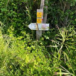 This app, like others, says, in the place where you start a post, “what have you been up to?” Again, the answer is walking. A lot of today’s walking was on wet feet. And wet feet led to one tiny blister. So annoying. There were stretches of long soaking wet grass and lots of mud. There was a bit of rain, enough to put on the rain jacket and sweat. But by early afternoon the sun was out and it got hot.