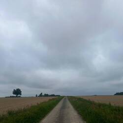I finally managed to get out the door not too long after 7:00. Got a few good hours in before it started getting humid. Not the most inspiring walk today. A forest. Small country roads with pavement. Two small villages with public toilets (!) and a big village with coffee in a cafe designed for parents with small kids. It had playhouses and dress up clothes. Cloudy skies for most of the day. And a few less than ideal