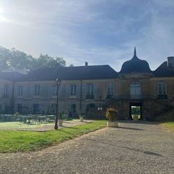 Lots of shaded paths morning and afternoon. And lots of breaks. Coffee in the courtyard of a chateau. Pain aux raisins on a shady bench. Tiny piece of pizza in the very pretty village of Montesquiou. Part way through the afternoon I was so hot I had to just sit down in the middle of the path, under a tree. And then a huge long break in the gorgeous hamlet of Pouylebon, with a selection of well placed picnic tables. I had to wait until the 4:30 “welcome” time.