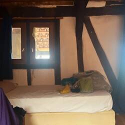 I’m staying in a private albergue tonight. Room of six people. Windows wide open (for which I am grateful). Everyone now is on their phone. Including me. But 5 of us had dinner at a bakery. And then came back to tour the two separate parts of the albergue. Their side comes with an open bottle of port and a stack of wee glasses.