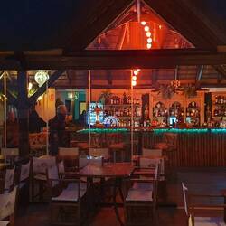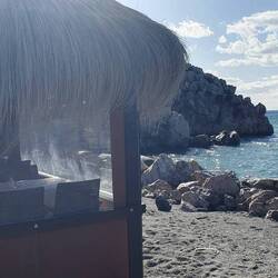 Dieses Strandrestaurant kann man nur empfehlen. Der Wind ist zwar noch heftig, aber wir sitzen hinter Sichtfolie geschützt, ein Kamin und Deckenstrahler wärmen, trotz 20°C in der Sonne.