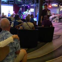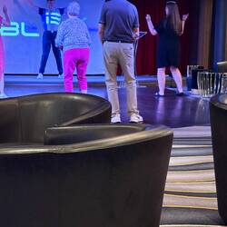 We got to the boat and had little lunch. Then back to the Bliss lounge for arts and crafts, bracelet making. We played name that mustache, celebrity heads and Broadway Posters trivia. We were sooooo close to winning that one but the other team had one more point than us. Jared went ahead and signed our card 3 times again. Spoke at length with a nice lady from Scotland’s high lands and I could have listened to her accent for hours. I was a good sport and joined the…shudder…disco dance class. Never again will we speak of that.