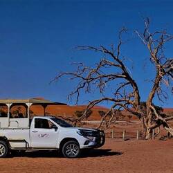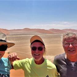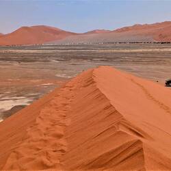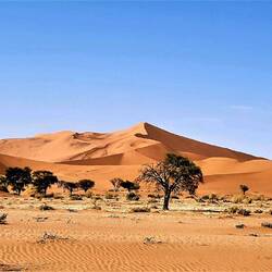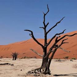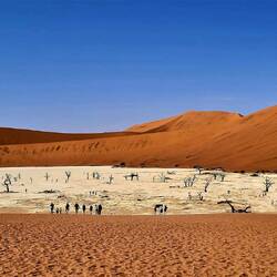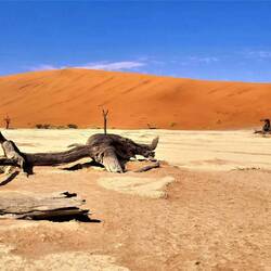 Bei Ankunft steigen wir in offene Allrad-Jeeps um, die durchpflügen ordentlich den Sand und das letzte Stück geht es zu Fuß weiter. Der Anblick der Dünen ist mehr als beeindruckend und die Vormittagssonne meint es schon richtig gut mit uns. So erreichen wir das Death Vlei (Vlei heißt so etwas wie See oder Meer). Hier gab es mal Wasser, wir merken es an dem eingetrockneten Schlammboden unter unseren Füßen. Vor über 600 Jahren erreiche der Tsauchab noch dieses Tal, es gab sogar einen See. Später nur noch unterirdisch und dann, ab Mitte des 14. Jhd. gaben auch diese Kameldornbäume den Geist auf. Da es hier so trocken ist, verrotten sie nicht und Namibia hat einen Touristen-Magnet mehr. Nicht zuletzt aber auch durch "Big Daddy", mit ca. 350 m eine der höchsten Sanddünen der Welt (im Hintergrund - den Aufstieg haben wir uns erspart).