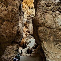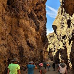 Anschließend noch der Abstieg in den Sesriem-Canyen. Hier ist auch heute zeitweise noch Wasser zu finden. Der Name heißt sinngemäß "sechs Riemen" weil vor langer Zeit die Dorslandtrekker sechs Riemen aus den Fellen der Oryx aneinander binden mussten, um das Wasser für ihre Tiere aus der Tiefe zu schöpfen.