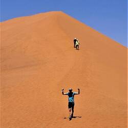 Bei Düne 45 wollen 3 "Mutige" (darunter auch der verrückte Schulze) in weit nach oben kraxeln, um von über 100 m Höhe den grandiosen Rundumblick mit nach Hause zu nehmen (man ist schließlich nur einmal hier!). Die Mittagshitze wird durch ein gutes Lüftchen gemildert und von oben ist unser Bus nur noch zu erahnen. Es hat sich gelohnt!