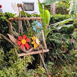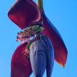 Direkt vor unserem Fenster entblättert sich eine gewaltige Bananenblüte und wir sind gespannt, wie groß die noch winzigen Früchte werden.Leer más