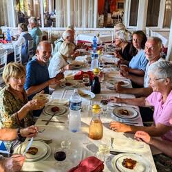 Bei sommerlichem Wetter passierten wir das Tor zum Campingplatz Scarabeo, fanden einen sehr schönen Platz unter Bananenstauden und richteten uns sofort häuslich ein. Auf Anhieb ergab sich eine Verabredung zum gemeinsamen Mittagessen in Santa Croce für Freitag, also übermorgen. Da werden wir schön mit den Rädern fahren. Am nächsten Tag freuten wir uns nochmal über das schöne Wetter, doch am Freitag war es vorbei damit. Zum Glück konnten wir bei unseren holländischen Freunden Nettie und Kees im Auto mitfahren, denn auch sie hatten keine Lust, durch strömenden Regen zu radeln. Der Regen dauerte 4 lange Tage an, aber wir ließen uns auch in dieser Zeit das morgendliche Bad im über 20° warmen Meer und die ausgedehnten Spaziergänge im nahe gelegenen Wald nicht nehmen.