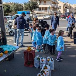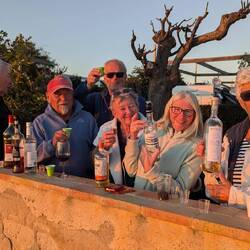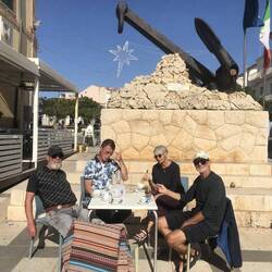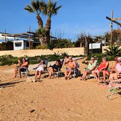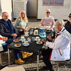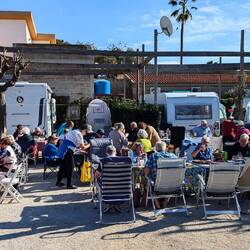 Am nächsten Tag war das Wetter wieder besser, man konnte sich wieder entspannt draußen aufhalten. Am Nachmittag waren alle Camperfreunde von den Platzeigentümern eingeladen zu Marsala, etwas Kuchen und zu einem kleinen (schon traditionellen) Geschenk: einer handgefertigten Keramik-Kugel. Aber auch die Leitung ging dank einiger Freunde nicht leer aus und nachdem sie auch ihre Angestellten gebührend beschenkt hatten, ergab sich für uns die seltene Gelegenheit, alle lieben Geister von Scarabeo zusammen auf einem Foto festzuhalten.