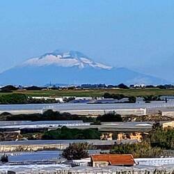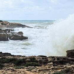 An einem ziemlich windigen Tag gab es eine derart fantastische Fernsicht, dass wir den in etwa 120 bis 140 km Entfernung liegenden Ätna klar sehen und fotografieren konnten. Die Wellen hielten uns zwar von unserem Morgenbad ab, aber dafür freuten sich die Hobbysurfer um so mehr.