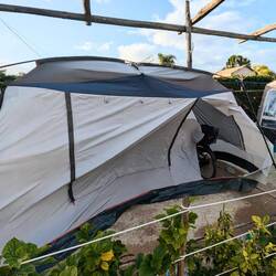 Der Tag vor Heiligabend zeigte sich nicht von seiner besten Seite. Kalt, regnerisch und stürmisch seit der Nacht und den stärksten Sturmböen am Mittag (etwa 100 kmh!) war unser Pavillon dann doch nicht mehr gewachsen. Aber noch stehen die Fahrräder einigermaßen trocken, bis zur Abreise tut er's und dann muss wohl ein Neuer her...