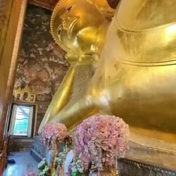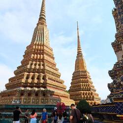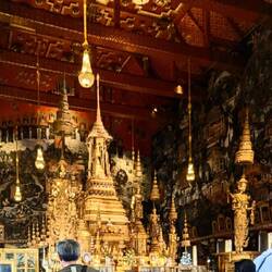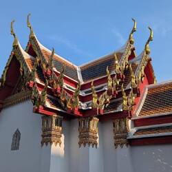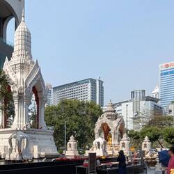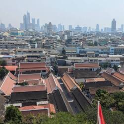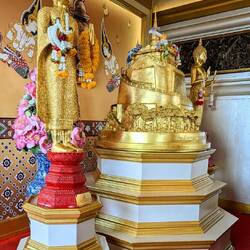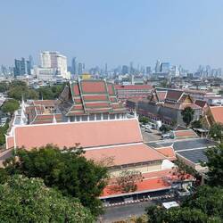 Oben erschließt sich eine Etage mit sehr vielen religiösen Utensilien und Gebets-Nischen, aber es gibt auch Getränke und Snacks. Noch ein paar Stufen höher gelange ich auf die oberste Plattform, bewundere hier wieder die Schönheit des Tempels und genieße die 360°-Aussicht auf Bangkok.Leer más