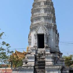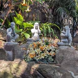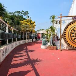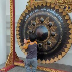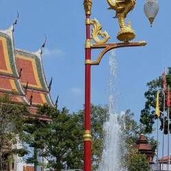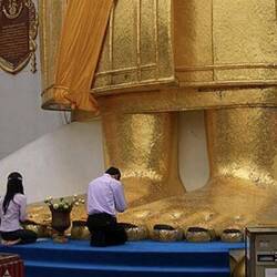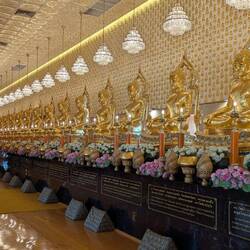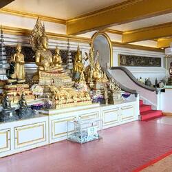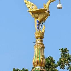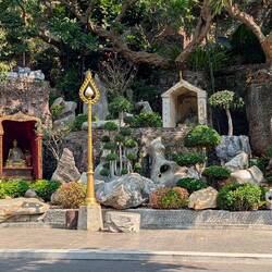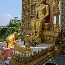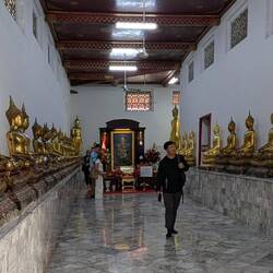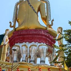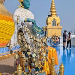 Je näher ich der einzigen Erhebung dieser flachen Stadt, dem 79 m hohen Hügel komme, um so deutlicher wird mir seine spirituelle Bedeutung. Wer kauft denn so viele Buddhastatuen, Glocken aller Größen und unendlich viele weitere religiöse Utensilien? Zeit, darüber nachzudenken, bleibt nicht, denn da stehe ich am Fuße des "Golden Mont". Eigentlich war es ein Hügel, der aber noch künstlich aufgeschüttet wurde und den jetzt ein goldener Chedi krönt. 318 Stufen werden nicht lang, wenn der Wegesrand so einfallsreich gestaltet wurde, wie hier. Gong und Glocken dürfen (und werden) von Jedermann zum Klingen bzw. Scheppern gebracht.