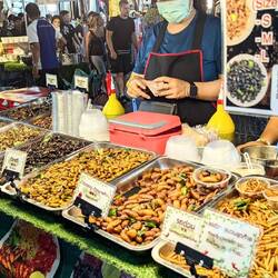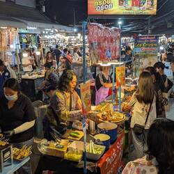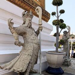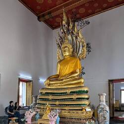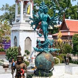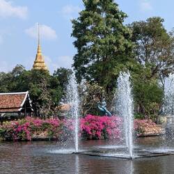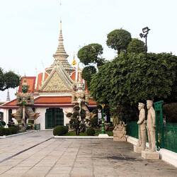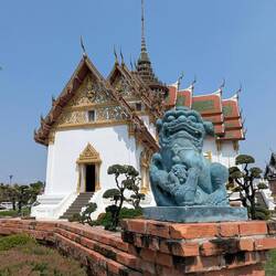Dieser Tempel steht auch mit auf meiner Agenda für Bangkok, ist nur etwa 2 km entfernt, also nutze ich die Zeit für einen Besuch, doch meide ich die umständlichen Busverbindungen. Das erweist sich alsbald als richtig. Meistens im Schatten wird es ein interessanter Fußmarsch. Der führt mich über eine Khlong-Brücke und dann durch eine touristenfreie (!) Seitenstraße. Es ist Mittag und ich esse erstmals nur in Gegenwart Einheimischer eine leckere Seafood-Suppe.