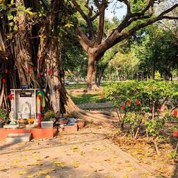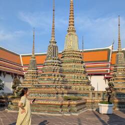 Gestern scherzte Rosi noch, dass sie mich um Fünf wecken wird, heute macht sie es wahr! Aber ich habe nichts dagegen, weil Freunde uns den Besuch dieses Tempels in der Frühe dringend empfohlen haben. Eine reichliche Stunde später steigen wir mal wieder am Wat Pho aus dem Bus, aber in der Dunkelheit fällt uns plötzlich dieser liebevoll gestaltete Schrein auf. In dem Tagestrubel übersieht man so etwas leider. Danach sehen wir die vier Chedis im Wat Pho wieder, dieses Mal in der Morgendämmerung - unsere Straße leer, keine Tuk Tuks, herrlich diese Ruhe!