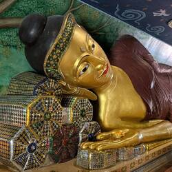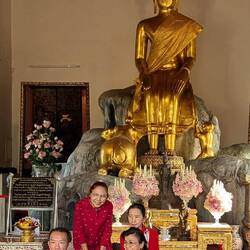 Skytrain und Bus bringen uns problemlos hin und plötzlich stehen wir vor dem Wat Traimit, einem Tempel, der auch noch auf unserer Liste der möglichen Ziele steht. Seine Besonderheit: er beherbergt eine ca. 700 Jahre alte und 3½ m hohe Buddha-Statue, bei der 1955 durch Bauarbeiten die Gipshülle beschädigt wurde. Zum Vorschein kam eine Figur aus Gold (im Sockel zu 4 %, im Körper zwischen 40 und 80% und das 45 kg schwere Gesicht aus purem Gold) insgesamt 5,5 bis 6 t Gold. Den unscheinbaren Gipsmantel, der im Laufe der Geschichte so viele "Umzüge" schadlos überstand, hatte man ihm verpasst, um ihn vor den Burmesen, die im 14. Jhd. ins Land einfielen und plünderten, zu schützen. Der Trick klappte, bis durch Zufall der wahre Wert sichtbar wurde.