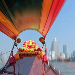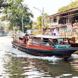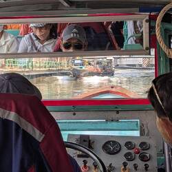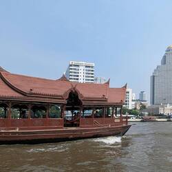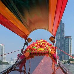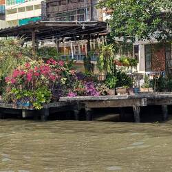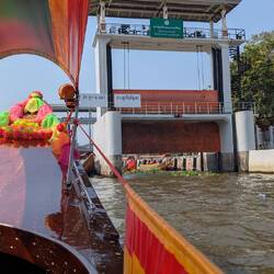 Erst geht es auf dem Hauptfluss vorbei an beeindruckenden Wolkenkratzern wie u.A. dem Hilton und dann schwenkt das Boot in einen der abzweigenden Khlongs, für den wir aber etwas Wartezeit an der Schleuse mitbringen müssen. Natürlich ist unser Boot genauso hübsch geschmückt wie dieses in der Gegenrichtung.
