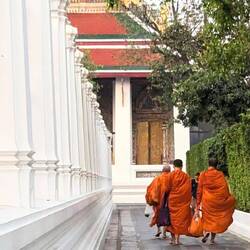 Dann am Fluss zeigt sich der Wat Arun gar nicht so (morgen-) rot. Aber das macht nichts, für 10 Baht (30 Cent) bringt die Fähre uns Beide hinüber und jetzt erkennen wir den Wert der Empfehlung unserer Freunde: das gesamte Tempel-Terrain ist menschenleer. Nun, das ist nicht korrekt, es ist völlig frei von Touristen. Eigentlich wird die Anlage erst in einer reichlichen Stunde geöffnet, aber uns begegnen viele Mönche auf dem Weg zur oder von der Stadt, wo sie die freiwilligen Opfergaben der Gläubigen sammeln. Der Begriff "Bettelmönch" ist daher nicht ganz korrekt. Und für diese Mönche sind einige Türen geöffnet, durch die wir legal das Tempelgelände betreten können. Wieder lassen wir voller Glück die friedliche Stille auf uns wirken und verharren noch eine Weile an diesem schönen Ort.
