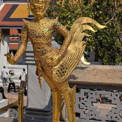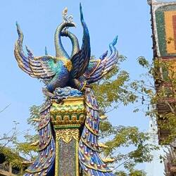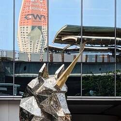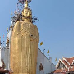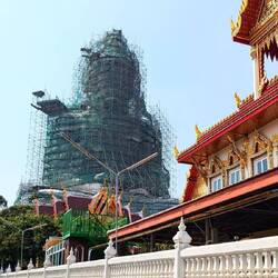 Google Maps führt mich durch abenteuerlich enge Gassen, aber um so schneller komme ich bei dem 32 m hohen stehenden Buddha an. Seine "Halskrause" hat er nicht immer, anscheinend seilen sich daran die Arbeiter bei der großen Buddha-Reinigung ab (das Titelbild stammt also auch aus dem Netz). Ich verweile eine Zeit lang, erkunde das Umfeld, finde ein paar unauffälligere Fotomotive und trete danach die Rückfahrt an. Auch dabei entdecke ich noch einen lustigen Anblick: Einhorn mit SkyTrain-Station und Hochhaus im Spiegel.