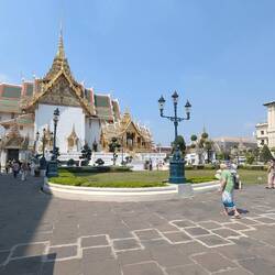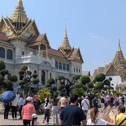 Aber gleich nebenan geht es los: Menschenmassen, dichtes Gedränge und laut schreiende Reisegruppen-Guides erzeugen eine Atmosphäre von Hektik und Stress, womit erstmal mein Entdeckergeist gelähmt ist. Aber als ich beginne, mich damit zu arrangieren, trifft mich der nächste Kulturschock. Träume ich? Kann das Realität sein? Die vielfältigen filigranen Gestaltungselemente lassen Tausend und eine Nacht wahr werden und übertreffen alles, was ich bisher kenne, einschließlich Marokko und Wat Pho. Das muss man erstmal verarbeiten! Die gesamte umlaufende Mauer schmücken fantastische Wandmalereien. Wieder einmal muss ich mich beim Fotografieren bremsen, aber ein paar Details müssen sein! Danach passiere ich das Modell von Angkor Wat, sowie einige auffällige Figuren, bevor mich der Strom zum höchsten Heiligtum aufsaugt. Es dauert, bis wir die riesige Halle betreten und hier drin ruht er, der Jadebuddha - angefertigt in der Zeit von König Rama I, 1434 entdeckt in Chiang Rai und 1778 über Umwege nach Bangkok in den Wat Phra Khaeo gelangt. Dieser kleine hochverehrten Buddha nimmt für die Thais und jeden Buddhisten eine überirdische Stellung ein (kein Thailänder würde im Namen dieser Statue einen Meineid leisten). Ist das der Grund, dass hier drin das Fotografieren verboten ist? Doch ich kann mich nicht zügeln. Heraus kommt ein Suchbild, die Auflösung ist dieser helle Fleck da oben. Ich setzte mich für einen Moment der inneren Ruhe auf den Boden, doch dann verlasse ich diesen (lauten) Saal der Stille. Der Weg durch die Mauer weist in Richtung "Grand Palace" und nach den Dimensionen der äußeren Mauern rechne ich jetzt mit dem zeitaufwändigen Hauptteil der heutigen Exkursion, aber große, prunkvolle Gebäude säumen meinen Weg, bis bald das Schild "Exit" auftaucht. Ich erkenne, dass der Großteil des Areals gar nicht für die Öffentlichkeit zugänglich ist, dass ich den Palast und einige weitere sehr schmucke Gebäude gesehen habe. Allerdings alles nur von außen - ob das immer oder nur temporär so ist, vermag ich nicht zu deuten. Und ich erkenne weiter, dass ich heute noch reichlich Zeit habe, mehr als vorgesehen. Aber da fällt mir garantiert etwas ein...Leer más