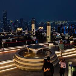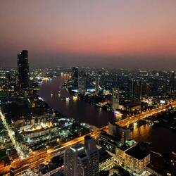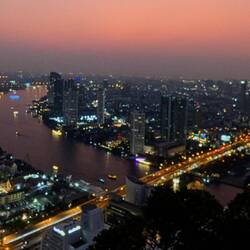 Dann begebe ich mich erneut zum Hotel Lebua, dieses Mal nicht nur mit Hemd und Hose, sondern auch mit festen Schuhen! Ohne Beanstandung darf ich den Aufzug betreten und es geht rasant nach oben - 64. Etage -. Wir werden mit nicht zu übertreffender asiatischer Höflichkeit begrüßt und sogleich erkundigt sich die hübsche Dame, ob ich einen Champagner wünsche. Ich wähle einen Cocktail (jetzt habe ich die Legitimation, mich hier oben aufzuhalten), nehme an der Bar Platz und lasse erstmal alles sacken. Ich genieße die Aussicht in der Dämmerung sowie die Ruhe (vom Lärm der Stadt kommt hier oben nichts an), lasse die Zeit verstreichen und verfolge den Einbruch der Nacht.