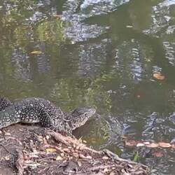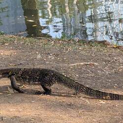 Danach Programmpunkt Lumphini-Park. Wir nutzen seine Schatten spendenden Bäume, um uns für den Heimweg fit zu machen. Nicht schlecht staunen wir, als wir zuerst einem und später noch weiteren Reptilien begegnen. Google verrät mir, dass es sich um Bindenwarane handelt, gute Kletterer und exzellente Schwimmer, die hier ihre Scheu vor dem Menschen verloren haben, so dass es auch schon zu unliebsamen Begegnungen gekommen sein soll. Wir halten lieber Abstand (zum Glück gibt's Zoom) und fahren wieder in Richtung Dusche und Klimaanlage.