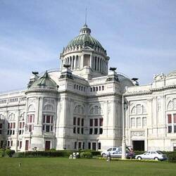 Unweit von hier befinden sich noch 2 Sehenswürdigkeiten, die sind fußläufig erreichbar. Den "schönsten" Tempel Bangkoks, weil komplett aus weißem Marmor aus der Toscana, den Wat Benchamabophit fotografiere ich mal schnell über den Zaun hinweg (langsam habe auch ich genug von Tempeln). Dann, auf dem Weg zum zum Wat Intharawihan sehe ich in der Ferne ein imposantes Gebäude. Es ist der Dusit Palace, den ein König hat bauen lassen, weil ihm der Grand Palace zu eng und im Sommer zu heiß war. Ich bekomme ihn zwar gut vor die Linse, natürlich mit viel Zoom, also ich mause mir noch ein Foto aus dem Internet.