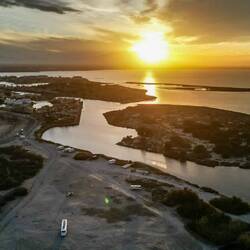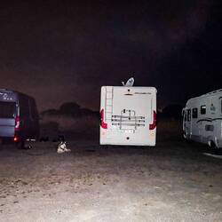 Nach unserer späten Ankunft gestern Abend haben wir uns auf dem großen Schotterplatz am Friedhof 🪦 positioniert, wo wirMeer informatie