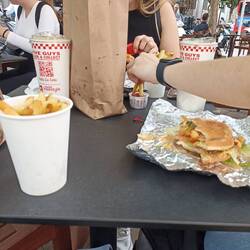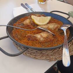 Comen un paella del mar y para mi pollo a la parrilla con patatas.