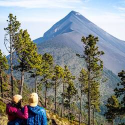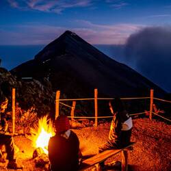 Gegen Abend schlossen wir mit unseren südkoreanischen Nachbaren Bekanntschaft. Andrew und Lim die ebenfalls ein Cabaña gemietet haben und in den USA Raumfahrttechnik studieren, hatten im Gegensatz zu uns einen privaten Guide dabei, der für sie kochte, Wein auftischte und vielleicht sogar Füsse massierte. Als wir unser Abendessen (feuchte Sandwiches) "genossen", bot er uns aus Mitleid etwas Pasta an und nahm uns später am Lagerfeuer mit heisser Schokolade auch unter seine Fittiche. Als es dann zu kalt wurde verzogen wir uns in unsere Häuschen, um ein paar Stunden später um kurz vor 4:00 wieder aufzustehen und für den Sonnenaufgang auf den Gipfel des Acatenango zu steigen. Etwas später sind wir dann den Berg mehr oder weniger wieder runtergerannt und durften uns am nächsten Tag über sehr schwere Beine und jeweilige Erkältungen freuen.