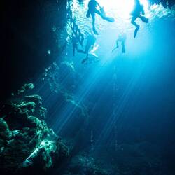 Als unseren ersten Tauchplatz haben wir die Cenote "El Pit" gewählt und werden auf unserem Tauchgang unter anderem von deren schieren Grösse erschlagen. Bei einer unfassbaren Sicht von etwa 100m fühlt es sich an als würden wir wortwörtlich durch die Tropfsteine und Lichtstrahlen fliegen. Auf einer Tiefe von etwa 15m wird die Sicht dann für einen Moment verschwommen und wir durchbrechen die sogenannte Halocline. Unter dieser Grenze wechseln wir ins Salzwasser. Auf etwa 30m Tiefe streifen wir dann durch die giftige Schwefelwasserstoffwolke (hydrogene sulfid cloud), um etwas später wieder den Wänden entlang im Kreisverkehr hoch zu steigen. Sprachlos von der unglaublichen Schönheit dieses Tauchgangs machen wir uns auf den Weg zur nächsten Cenote.